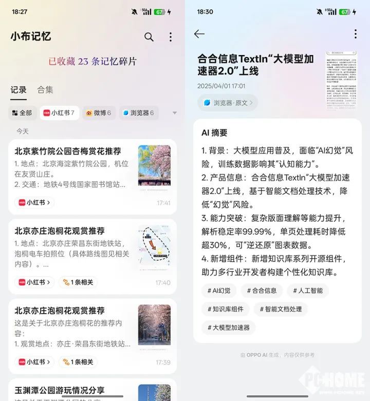 我们在社交平台看到的精美照片,保存下机位信息,也能通过一键闪记功能来实现,在需要查看时,小布还会提供所有与之相关的消息。看到篇幅较长的技术类文章,也可以先保存下来,查看时小布会通过AI提炼出摘要信息,方便我们深度理解。