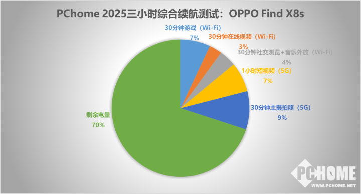 续航方面,OPPO Find X8s配备了5700mAh电池,在小屏机型中,这个电池容量可是非常大的,甚至比Find X8标准版的电池还大。如此电池容量在续航方面自然十分可靠。3小时续航实测剩余电量70%,成绩已经超越部分大屏旗舰。看来小尺寸屏幕在省电上很有优势,5700mAh的电池,在实际续航表现上,完全能比肩6000级别的大屏机。