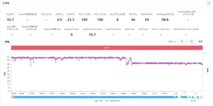 在负载更大的《崩铁》黄金时刻跑图中,OPPO Find X8s平均帧率55.7帧,前半程可以稳定跑满帧。从7分45秒开始出现了亮度降低,并进行了帧率限制。当然,OPPO目前的优化策略可能也比较激进,在实际使用中,大可使用标准模式进行游戏。