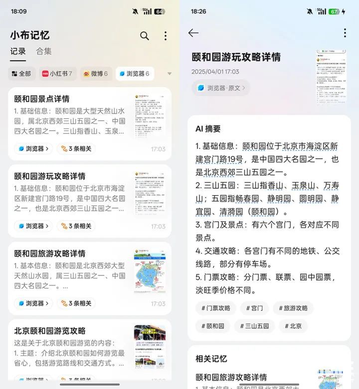 我们实际上手过后,发现其可以快速保存我们想要留存的各种信息,方便日后的信息查找。比如我们看到了游玩攻略,想要保存起来,那么只要在当前页面长按快捷键就行。在小布记忆中查看时,则会智能化的将乘车线路、游玩线路等信息进行AI摘要。
