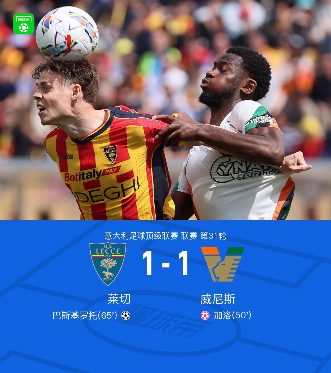 意大利足球顶级联赛第31轮,莱切主场迎战威尼斯。比赛中,莱切的加洛不慎将球送入自家球门,不过巴斯基罗托随后接到赫尔加松的助攻打入一球,为球队扳平比分。最终,莱切与威尼斯以1-1的比分握手言和。