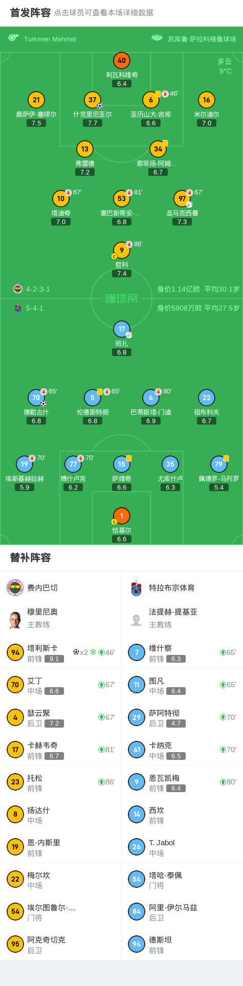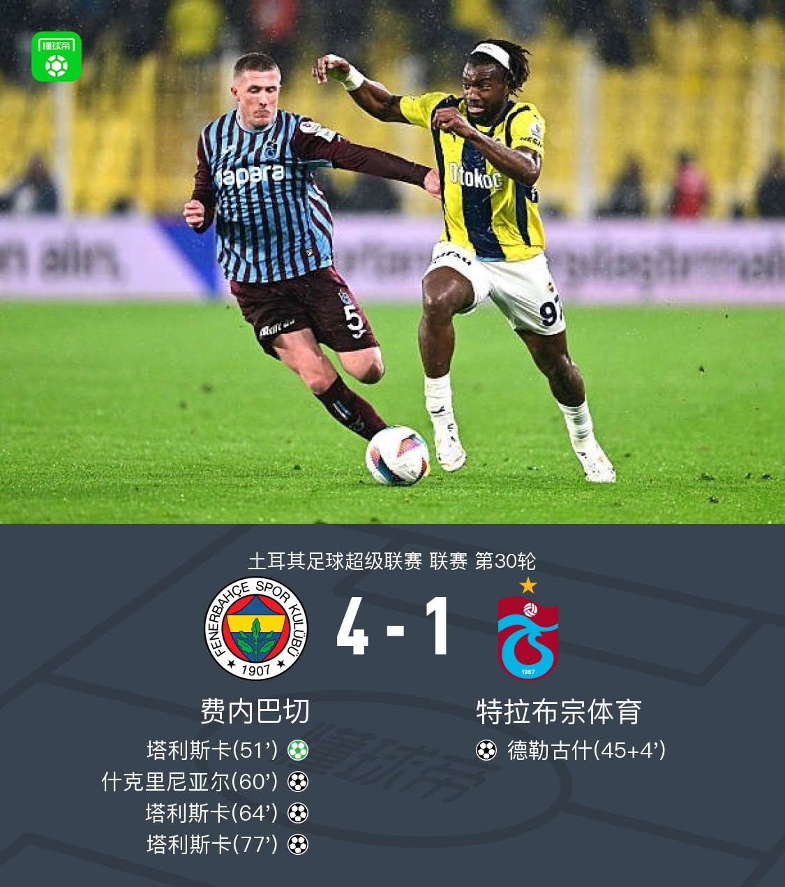 北京时间4月7日,土耳其足球超级联赛第30轮,费内巴切主场迎战特拉布宗体育。比赛中,特拉布宗体育由德勒古什率先打破僵局。随后,费内巴切展开反击,塔利斯卡通过点球扳平比分,并在之后完成帽子戏法,成为球队取胜的关键人物。此外,什克里尼亚尔也为费内巴切贡献一粒进球。最终,费内巴切以4-1战胜特拉布宗体育。