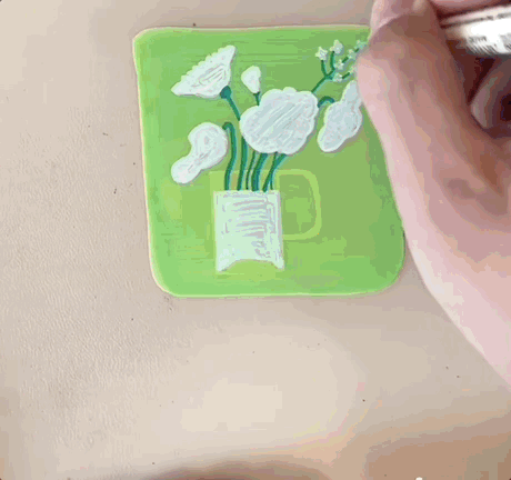 颜料干透后,就是十分考验耐心的粘籽环节。
