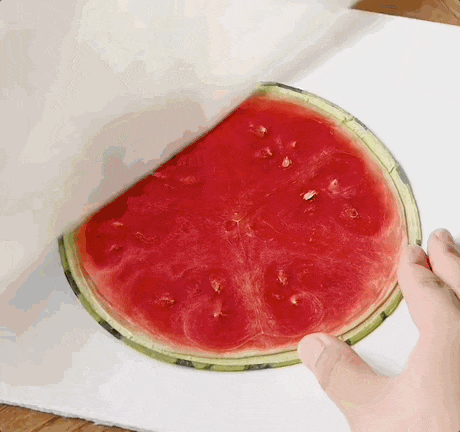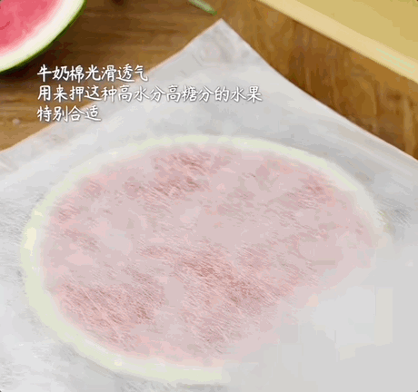 西瓜切出圆圆一片,上下依次盖牛奶棉、海绵和吸水板,压紧实。