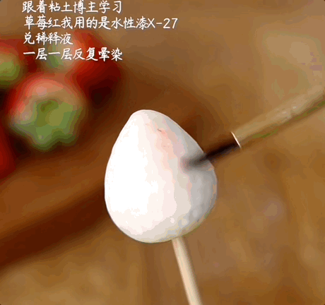 等草莓白膜干透后,一层层晕染上稀释后的水性漆颜料,