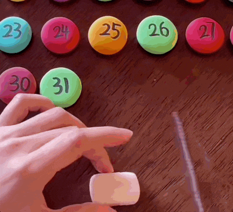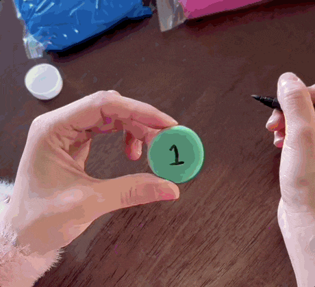 用黑色记号笔,在各色粘土饼上写下1-31的数字。