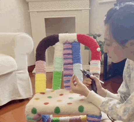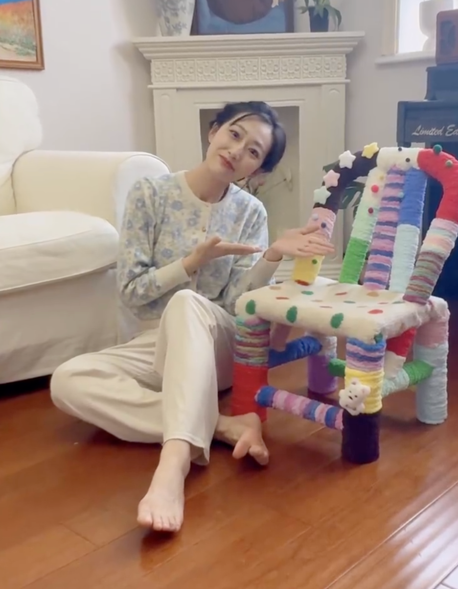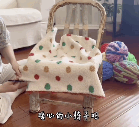用胶枪固定好坐垫后,根据自己的喜好随意选择毛线缠绕在椅子腿和靠背上。