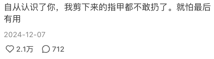 “自从认识了你,我剪下来的指甲都不敢扔,就怕有用。”