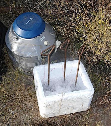 不同于热烙印的趁热打铁,冷冻烙印讲究一个趁“冷”打铁:人需要先将铜或铜合金烙铁冷却至-100°C至-300°C。常用的冷却剂是液氮(一种温度为零下 196°C 的液体,是氮气在极低温度时形成的液体形态),或者是干冰和酒精的混合物。