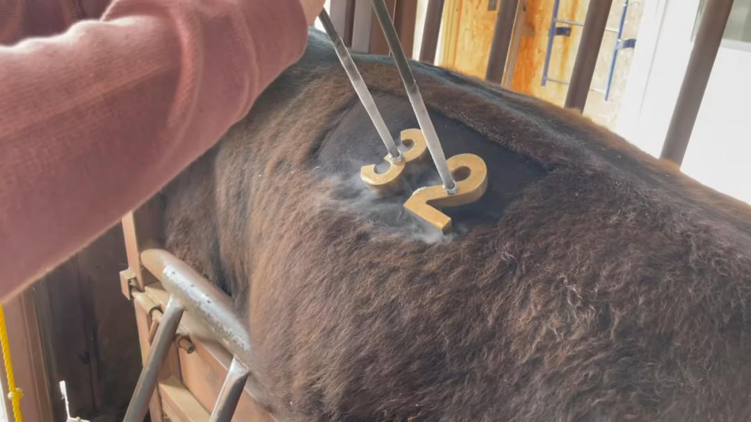 此外,牛身上待会儿要被打上烙印的部位会被剃毛,然后喷上酒精。接着,人会将完成冷冻的低温烙铁压在牛的皮肤上,维持大约30秒。