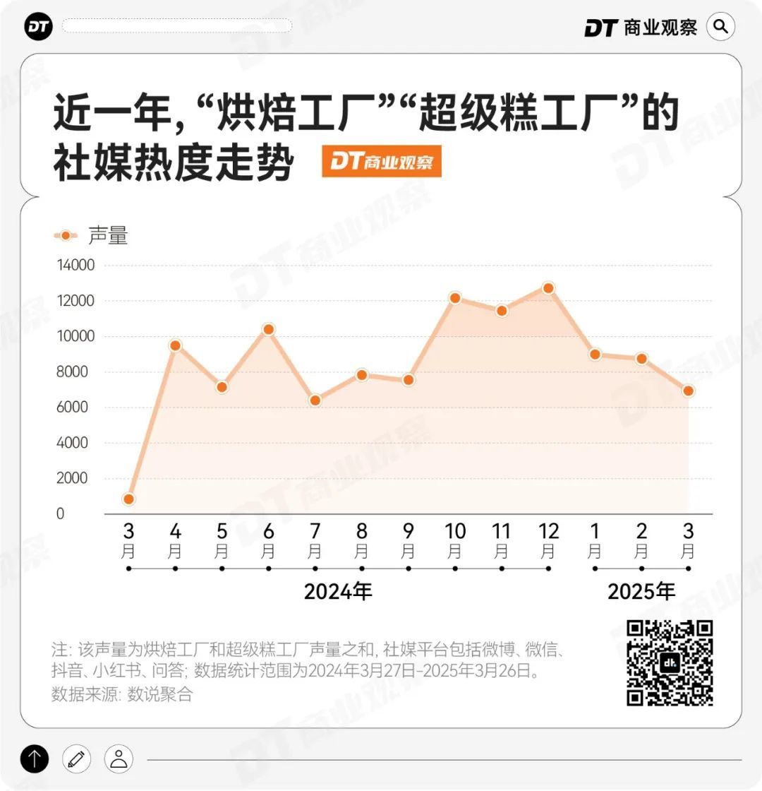从2024开始,“烘焙工厂”在社交媒体上的声量不断攀升,去年年底,一批新品牌入场开设首店,把烘焙工厂的声量推到峰值,2025年初,虽然社媒声量有所回落,但还是远超2023年。