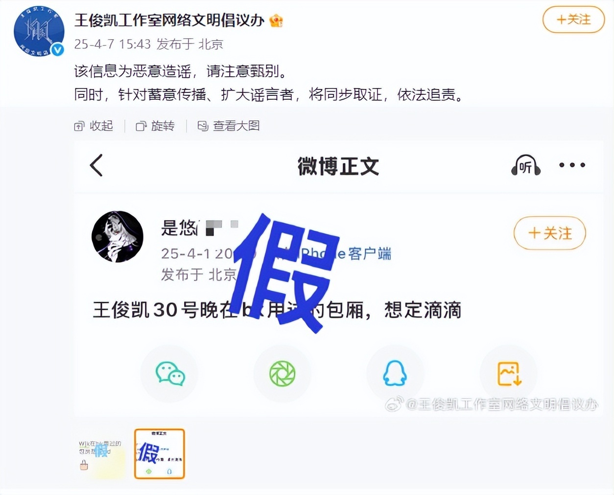 对此,7日下午,@王俊凯工作室网络文明倡议办 发布声明:“该信息为恶意造谣,请注意甄别。同时,针对蓄意传播、扩大谣言者,将同步取证,依法追责。”