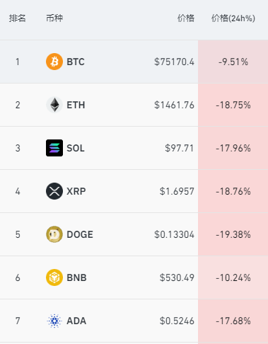 比特币24小时跌幅超过9%,一度跌破75000美元,为2024年11月以来首次。截至发稿,比特币最新价格报75170美元。