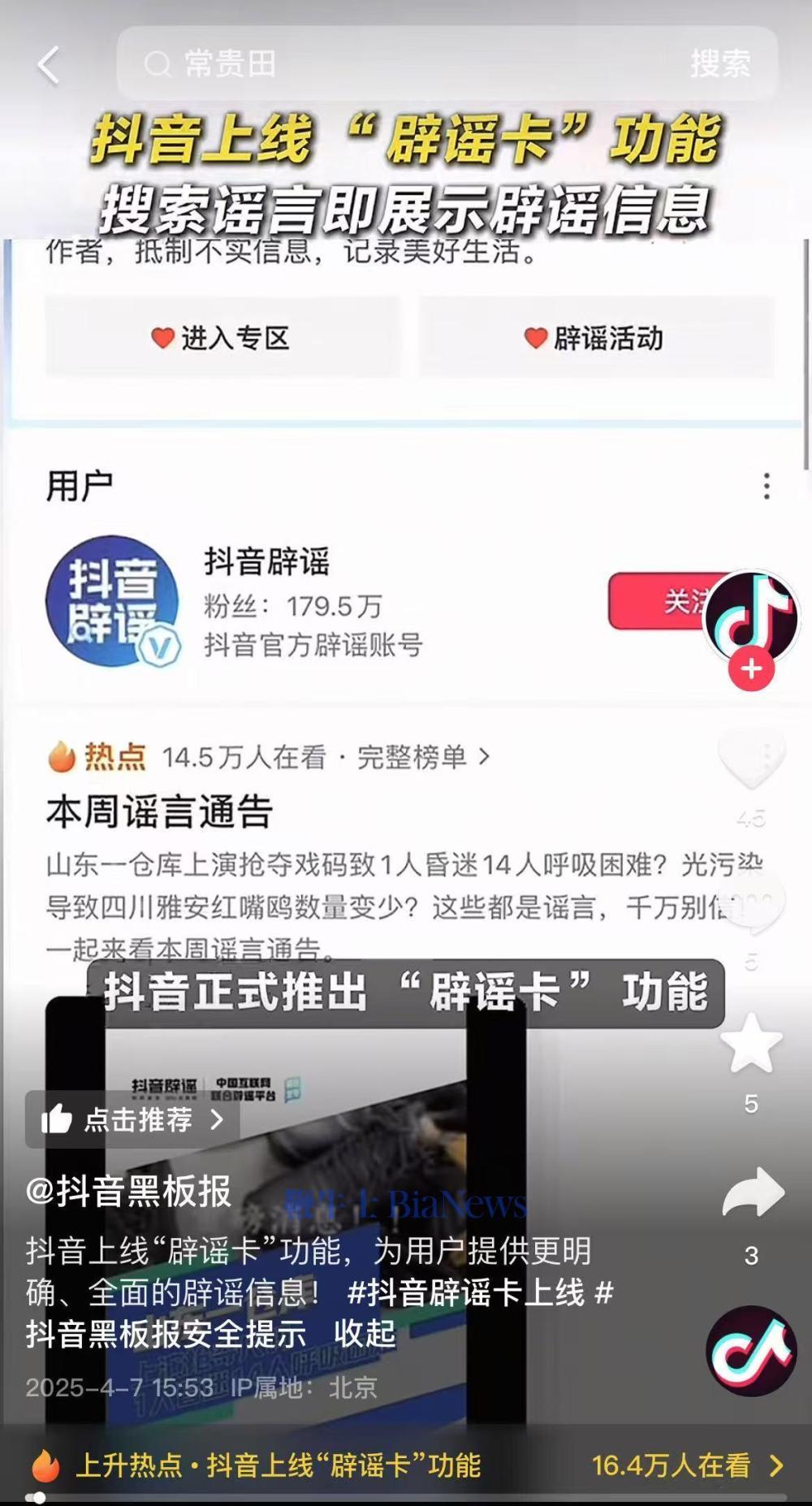 4月7日,抖音黑板报宣布,抖音正式推出“辟谣卡”功能,旨在为用户提供更明确、全面的辟谣信息。