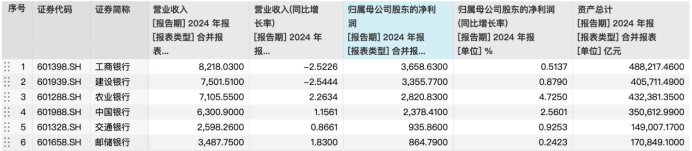 六大国有银行2024年财报数据,来源:Wind