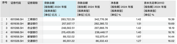 在净息差方面,2024年,邮储银行、建设银行、农业银行、工商银行、中国银行和交通银行净息差分别为1.87%、1.51%、1.42%、1.42%、1.40%和1.27%,较上年末分别下降0.14个百分点、0.19个百分点、0.18个百分点、0.19个百分点、0.19个百分点和0.01个百分点。