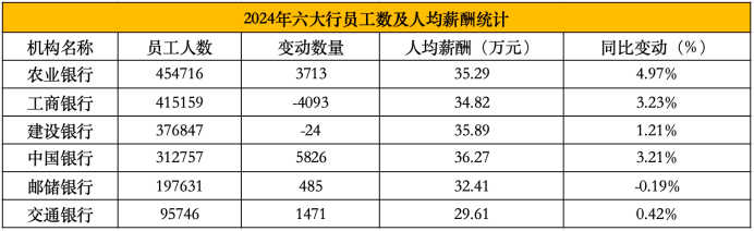 按照集团统计口径,2024年,农业银行、工商银行、建设银行、中国银行、邮储银行、交通银行的员工人数分别为454716人、415159人、376847人、312757人、197631人和95746人。