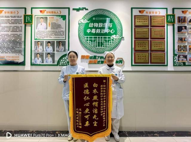 近日,南华大学附属南华医院纪检监察室收到一份来自外省的跨越千里的特殊礼物——两面分别印着“妙手扶桑梓,高医攀新峰”“白衣燕帽洁无坐,医德仁心更可亲”的锦旗,致谢动物致伤与中毒救治中心医护团队。