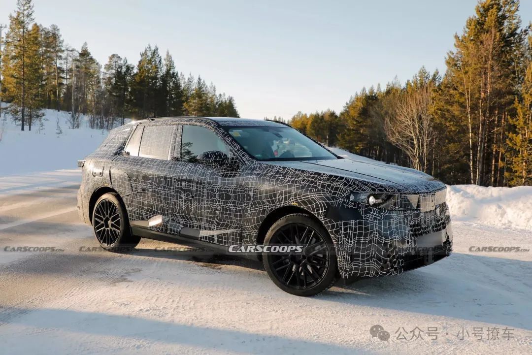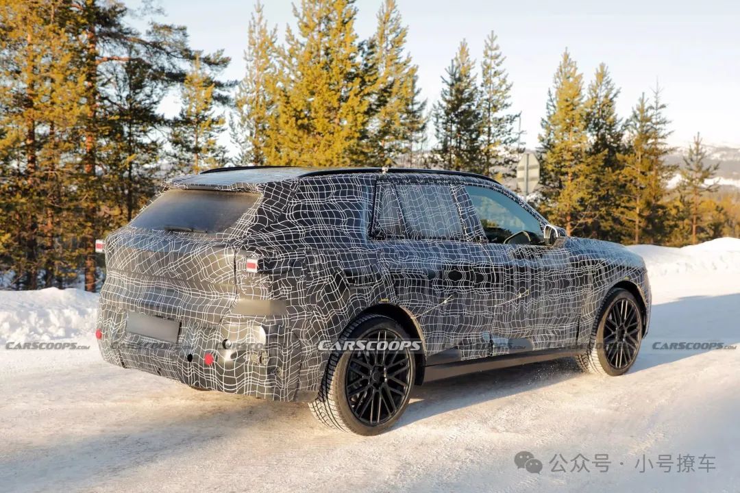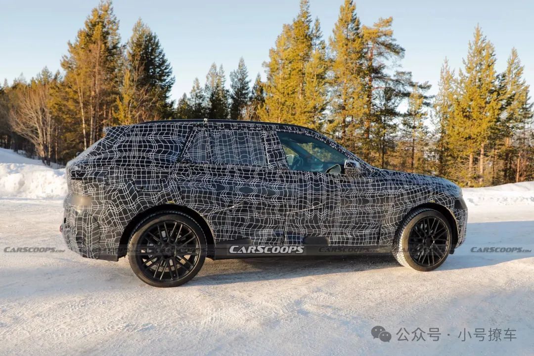 侧面造型方面,车身多少还是能够看到一点现款宝马X5的设计元素,车顶略带一点弧度,配备有粗壮的行李架以及鲨鱼鳍,带来了一定的力量感;腰线采用了贯穿式设计,从前翼子板延伸到车尾,让视觉效果显得修长大气;门把手的设计很有意思,并非隐藏式,也并非传统的门碗,而是在B柱和C柱部分加入了一个小小的把手,从理论上来讲,这样开门会比较费力,所以新车带大概率会采用自动门设计。