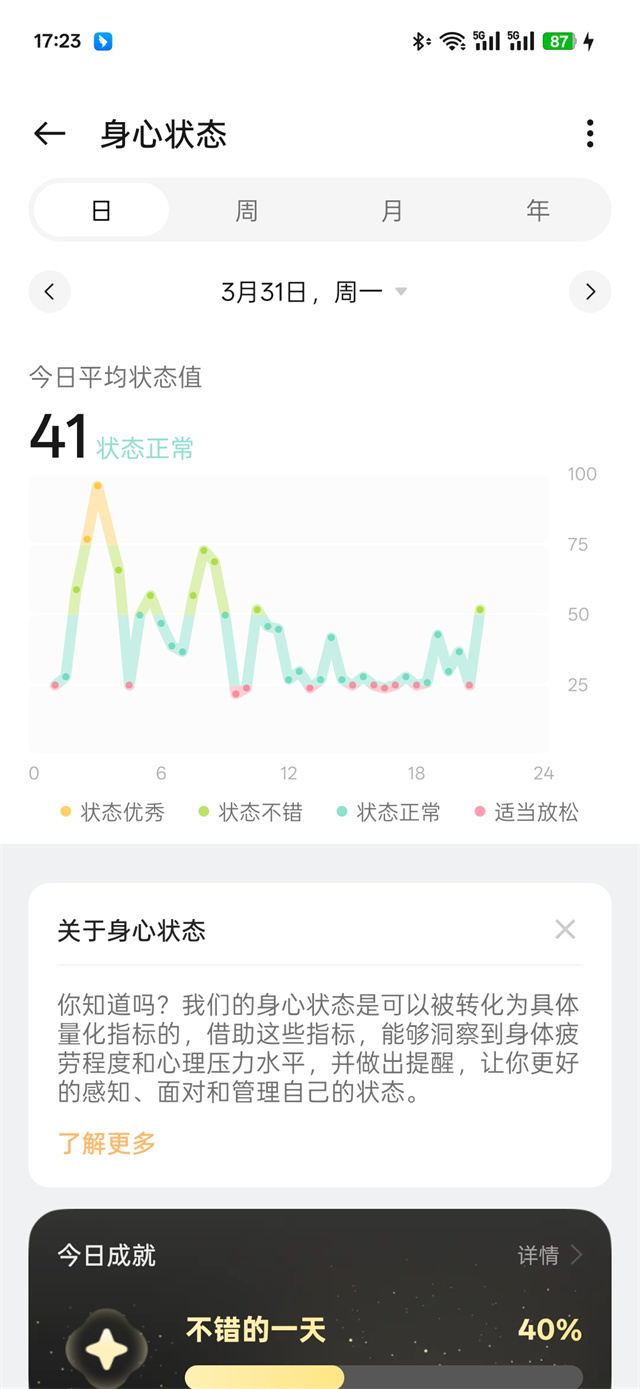 OPPO Watch X2 Mini这一次也关注了用户的身心健康,支持了身心状态检测,能够根据身体的HRV、心率、活动强度等多维度的健康数据,通过这些各项指标状态能够及时的了解到自己身体疲劳程度和心理情绪状态,自己的身心状态抬腕就可见,能够随时了解自己的状态变化,App中还有身心状态改善建议,帮助用户及时调整自己的身心状态,可以说OPPO Watch X2 Mini十分懂你。