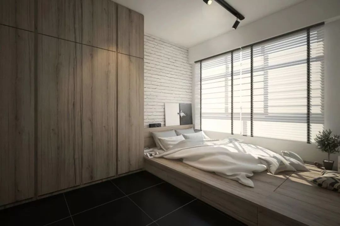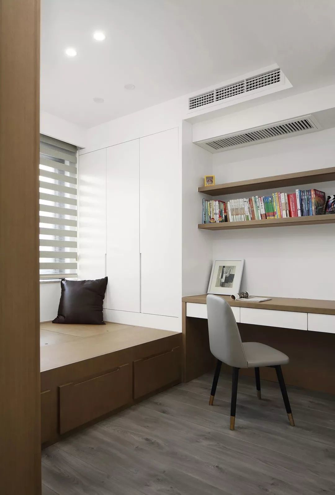 或者是选择做上榻榻米衣柜的设计,把衣柜做在床尾的地方,和榻榻米结合在一起,搭配书桌柜来摆放,看起来也舒服。