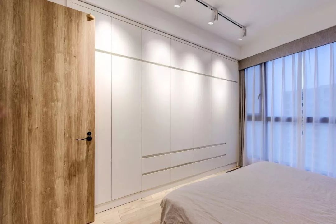 但在外观上却能够让人感觉非常的简洁、舒适,就算是做上了满墙的柜子,也不会觉得卧室太过压抑,搭配轨道灯、筒灯更加好看。