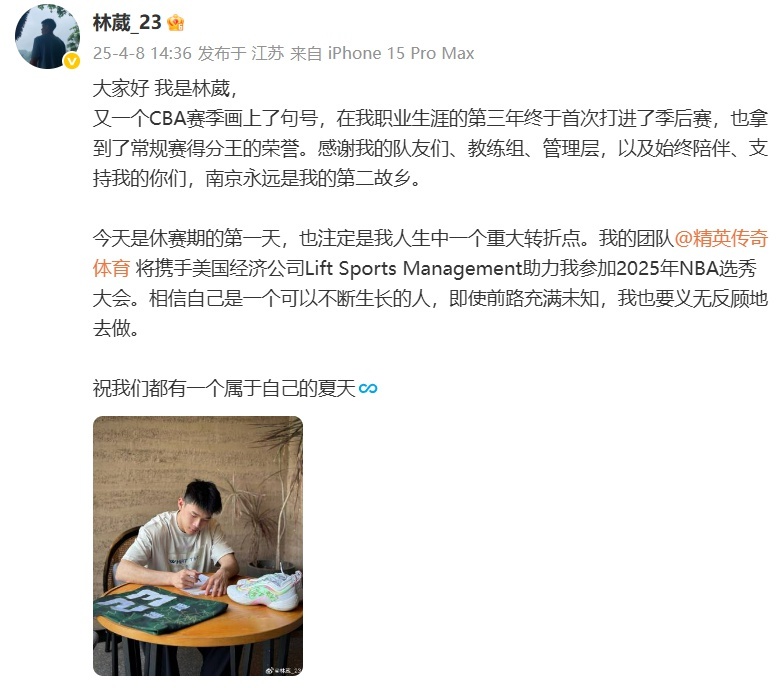 林葳称:“今天是休赛期的第一天,也注定是我人生中一个重大转折点。我的团队精英传奇体育将携手美国经济公司Lift Sports Management助力我参加2025年NBA选秀大会。相信自己是一个可以不断生长的人,即使前路充满未知,我也要义无反顾地去做。”