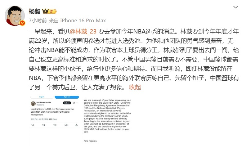 此前,篮球评论员杨毅也对林葳将参加2025年NBA选秀大会发表评论。