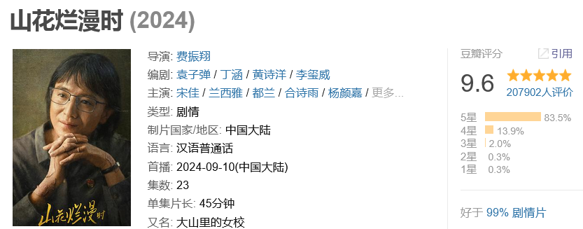 2024年12月24日,豆瓣2024影视榜单正式发布,《山花烂漫时》豆瓣9.6分,成为2024年的国剧口碑王。九派新闻搜索发现,超20万观众在豆瓣为《山花烂漫时》打分,83.5%的网友打出五星好评。