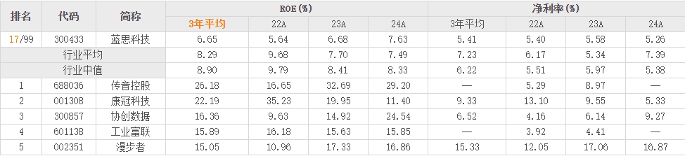 首先从ROE近三年的平均水平来看,蓝思的6.65%低于行业平均值8.29%、行业中值8.90%,更是低于同行漫步者15.05%、工业富联15.89%,更别说传音控股的26.18%或者康冠科技的22.19%。净利率的水平也同样低于行业水平。