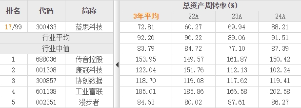 但是结合行业水平来看,蓝思还是落后于行业步伐。就拿总资产周转率来说,蓝思近三年平均水平72.81%,低于行业平均水平92.26%,行业中值83.79%,更不要说远远低于同行传音控股的153.95%,康冠科技的122.04%,漫步者的84.63%。