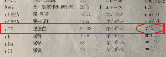 比如下面这个,不就写着尿蛋白0.423吗?也是在0.5g以内的,意思是达标了吧?