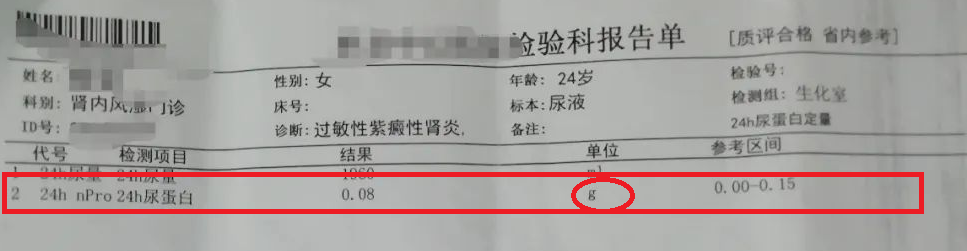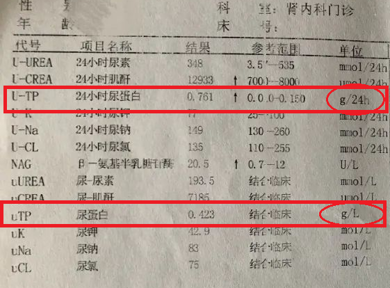 所以,大家在看检查单时一定要注意,要看24小时尿蛋白定量,单位是g或者g/24h的那一项。