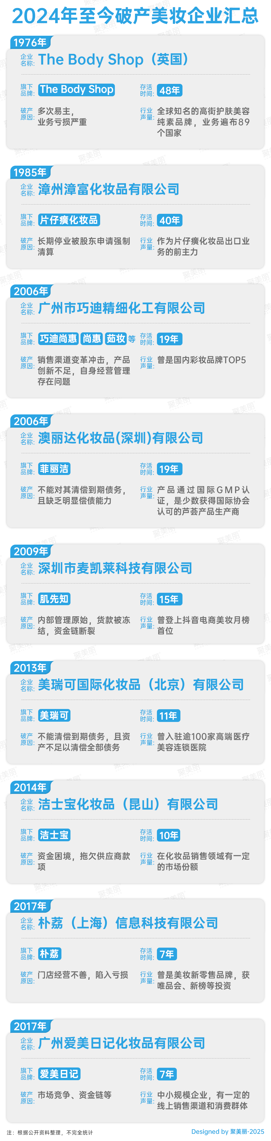 据聚美丽不完全统计,2024全年至少有46家企业进入破产清算程序,覆盖原料商、品牌商及零售商全产业链。在众多企业中,不乏有已扎根市场超过20年的老牌企业: