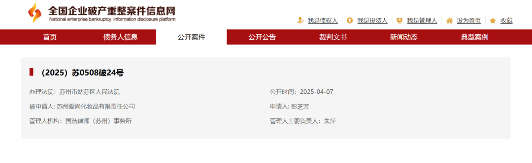 近日,据全国企业破产重整案件信息网披露,彭芝芳申请苏州爱尚化妆品有限责任公司(以下简称“苏州爱尚”)破产清算。