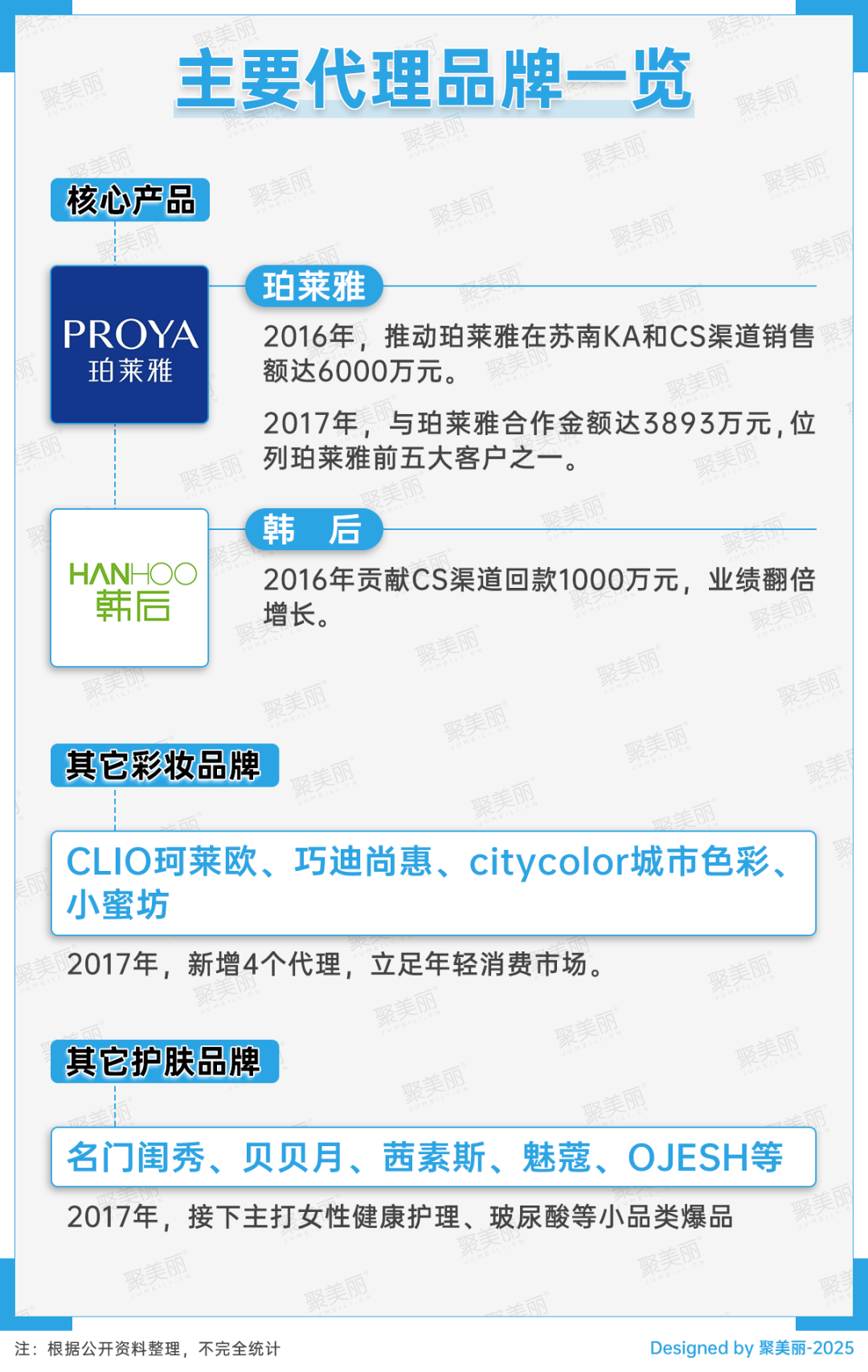 在代理品牌方面,除了上文提到的珀莱雅和韩后。在2017年,开始涉足小品类与爆品方面。其中,彩妆不乏具有一定知名性的,如CLIO珂莱欧、巧迪尚惠、citycolor城市色彩、小蜜坊;护肤也涉及名门闺秀、贝贝月、茜素斯、魅蔻、OJESH等品牌。