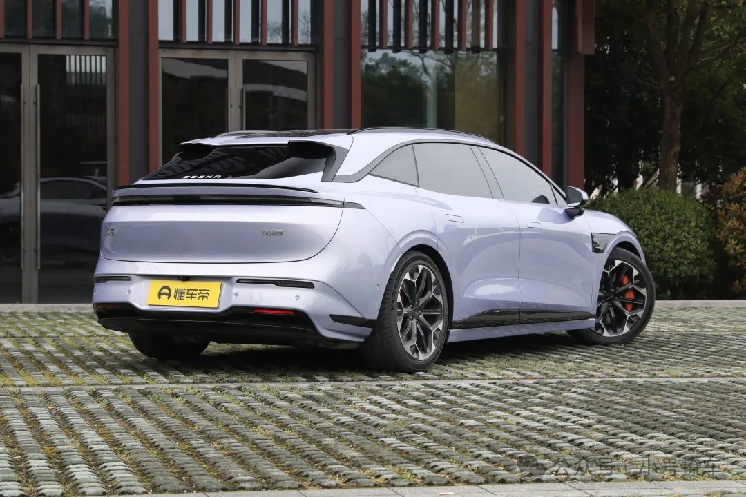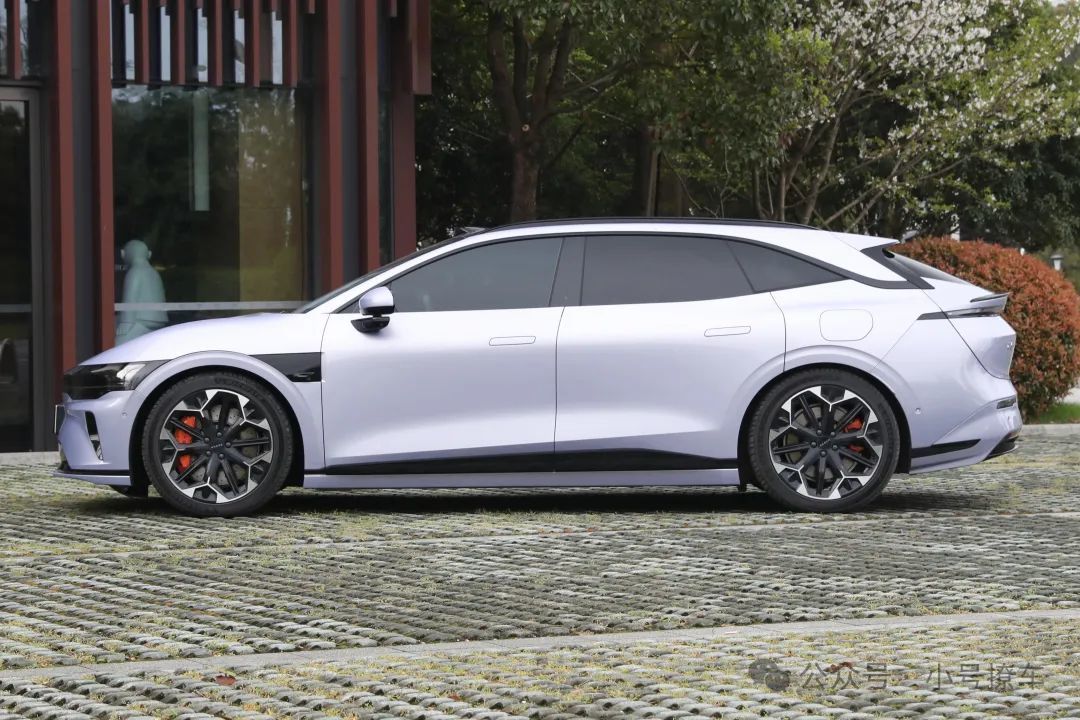 侧面造型方面,车顶带着明显的弧度,配备有粗壮的行李架,凸显了力量感,车顶还带着点悬浮式造型,属于典型的猎装车风格;车身下半部分的造型和极氪007基本上保持一致,贯穿式的腰线让车身显得比较修长,弹出式门把手也能起到降低风阻的作用;轮毂采用了双色五辐式花瓣造型,风格还算简洁。