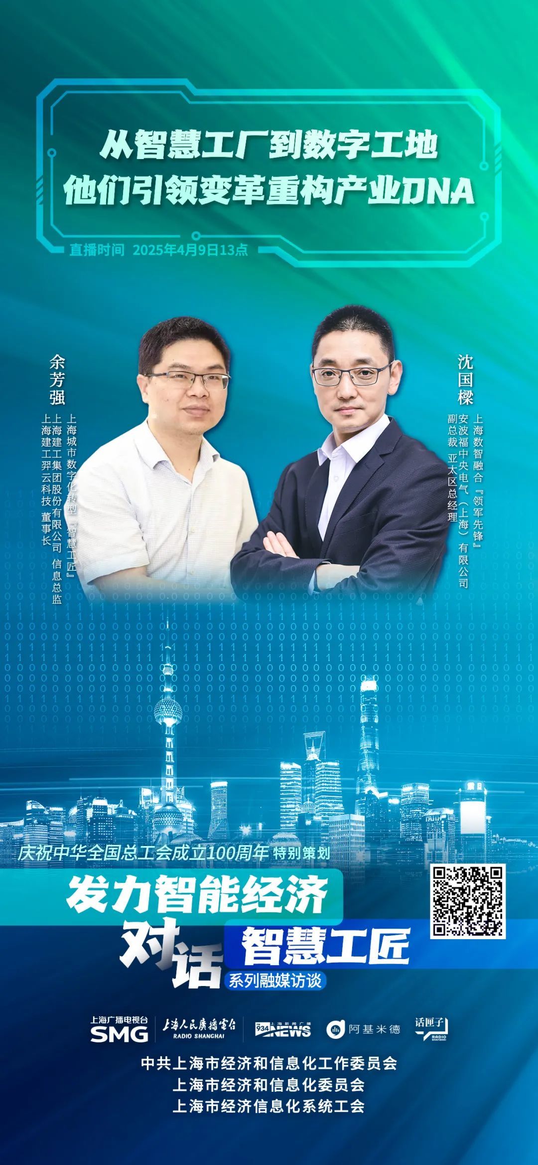 今天下午1点-2点将对话上海城市数字化转型“智慧工匠”、上海建工集团股份有限公司信息总监余芳强;上海数智融合“领军先锋”、安波福中央电气(上海)有限公司副总裁沈国樑。敬请关注。