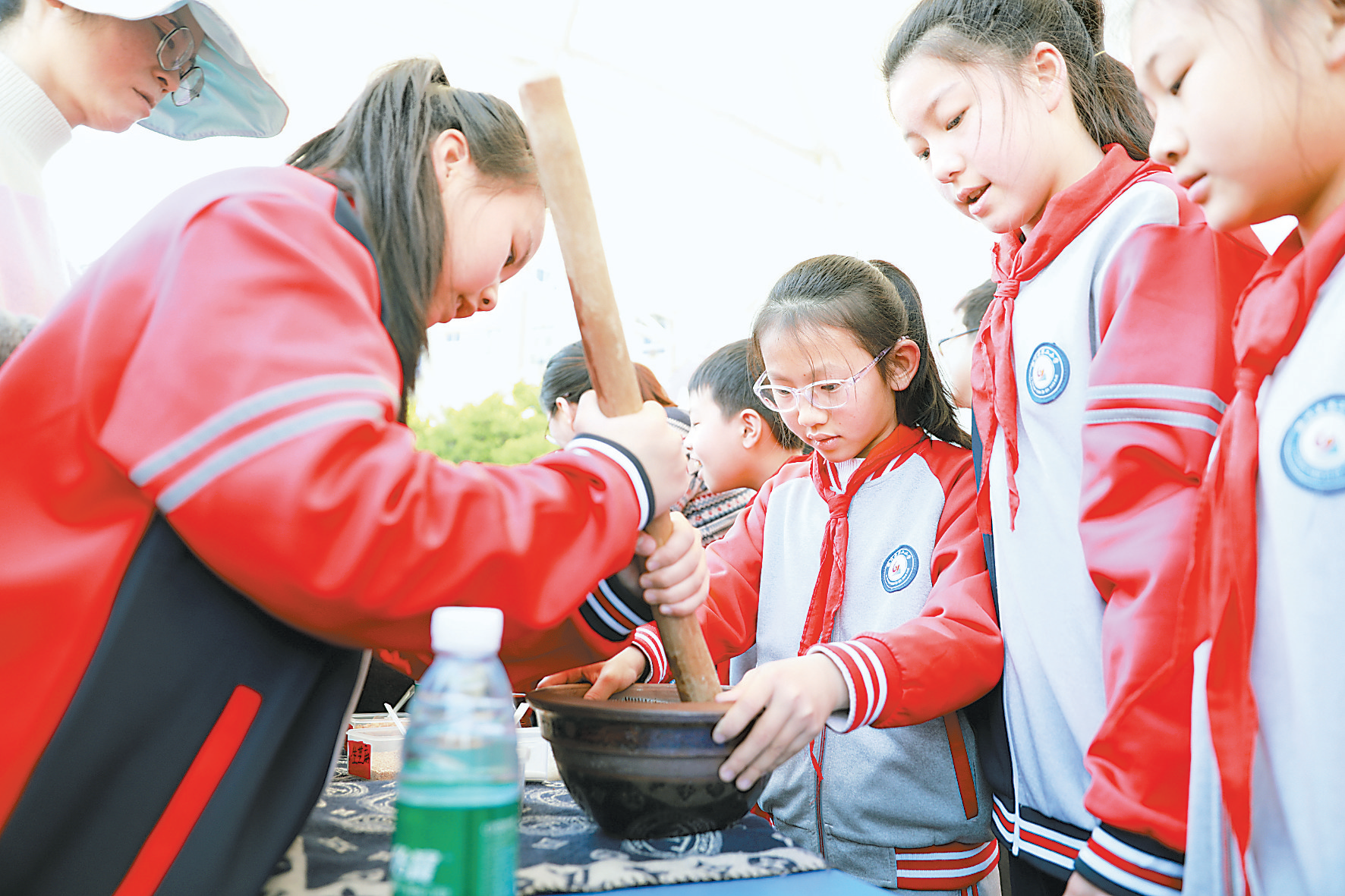 4月3日,黎川县第二小学学生们正在学习擂茶制作。为了让学生深入了解传统文化,培养动手能力和创造力,黎川县各中小学将舞白狮、擂茶等特色非遗项目引入课堂,让学生们近距离接触传统技艺与特色文化,丰富校园生活,增强文化自信。 葛运琪 周跃 摄