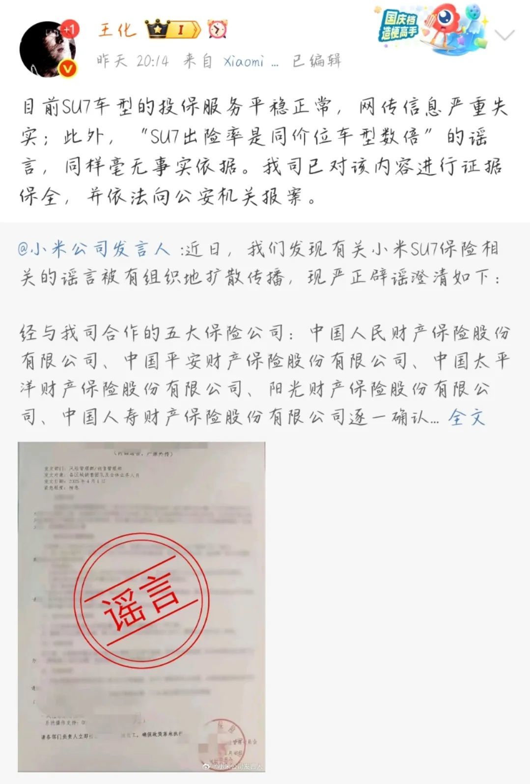 雷达财经注意到,随后,小米集团公关部总经理王化转发该博文并表示:“目前,SU7车型的投保服务平稳正常,网传信息严重失实;此外,‘SU7出险率是同价位车型数倍’的谣言,同样毫无事实依据。我司已对该内容进行证据保全,并依法向公安机关报案。”