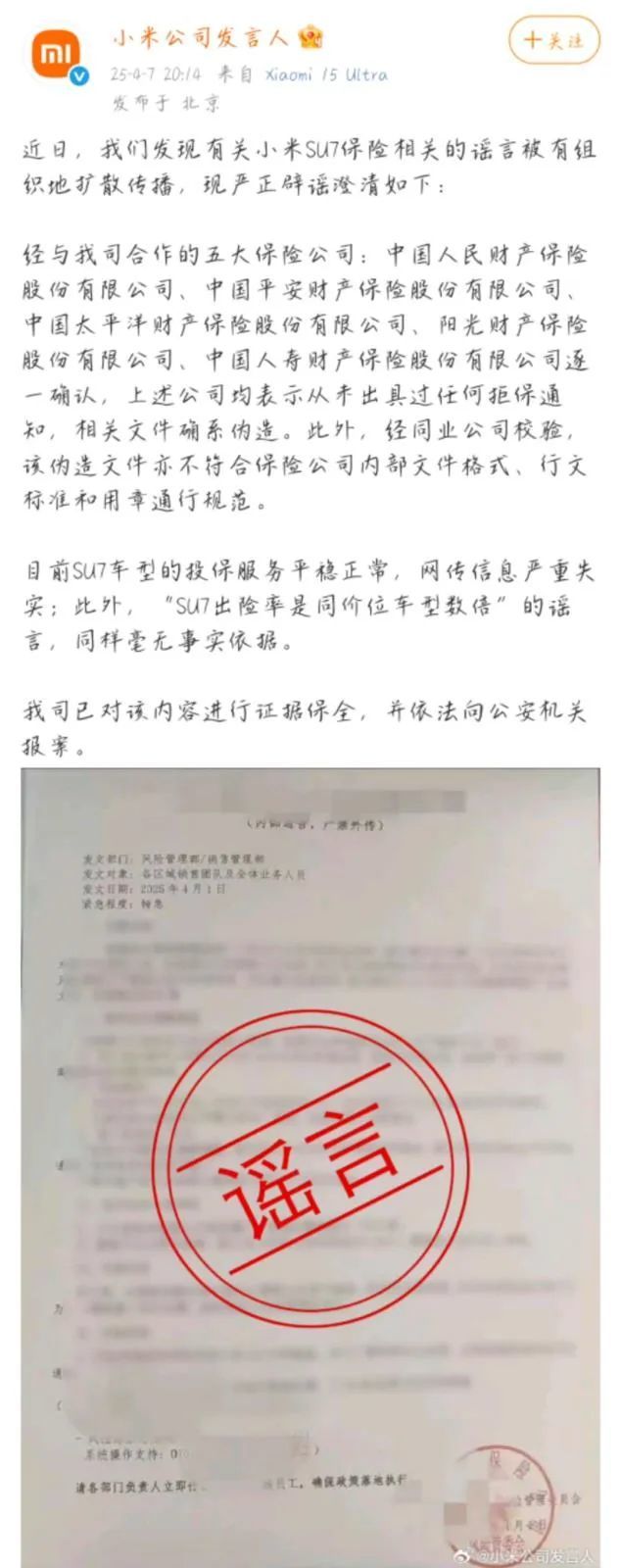 小米公司发言人还表示,经与小米公司合作的五大保险公司(中国人民财产保险股份有限公司、中国平安财产保险股份有限公司、中国太平洋财产保险股份有限公司、阳光财产保险股份有限公司、中国人寿财产保险股份有限公司)逐一确认,上述公司均表示从未出具过任何拒保通知,相关文件确系伪造。此外,经同业公司校验,该伪造文件亦不符合保险公司内部文件格式、行文标准和用章通行规范。
