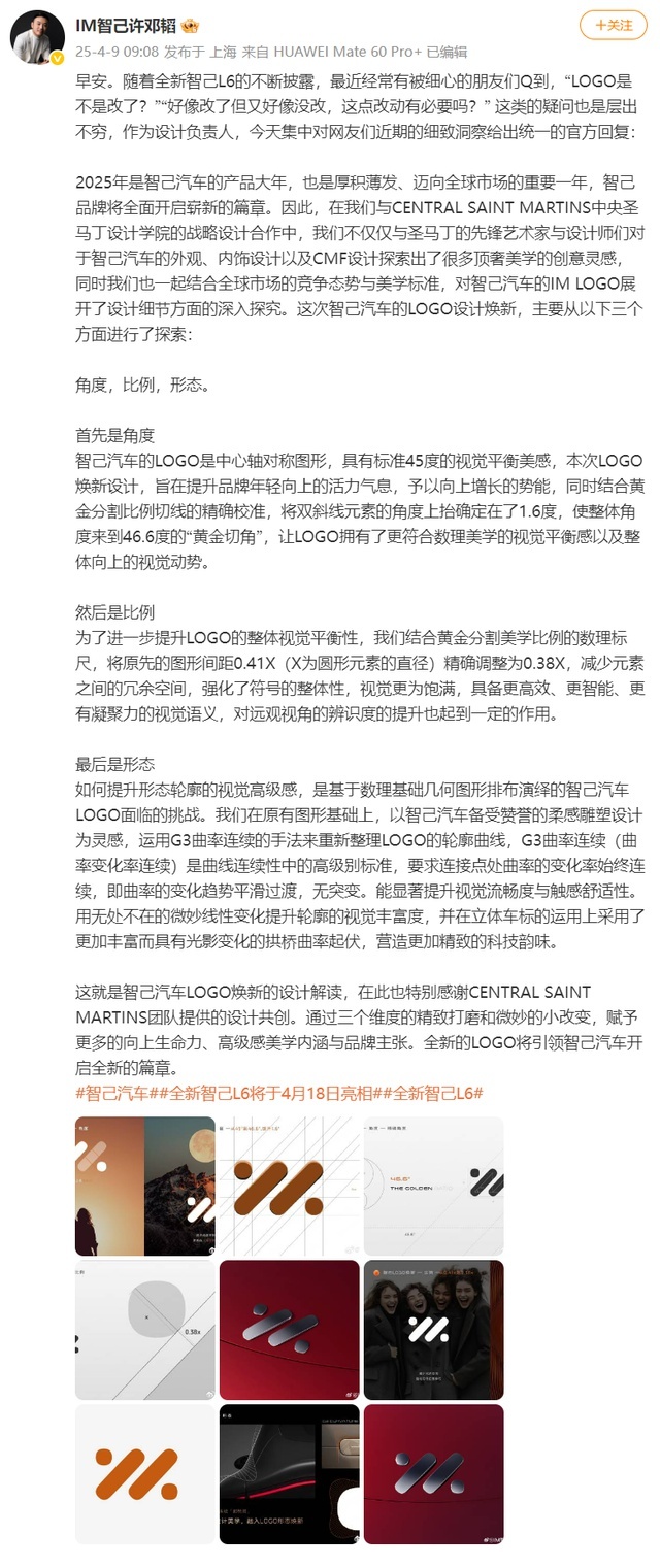 4月9日,智己汽车创意设计中心执行总监邓韬在微博发文称,随着全新智己L6的不断披露,最近经常有被细心的朋友们Q到,“LOGO是不是改了?”“好像改了但又好像没改,这点改动有必要吗?” 这类的疑问也是层出不穷。
