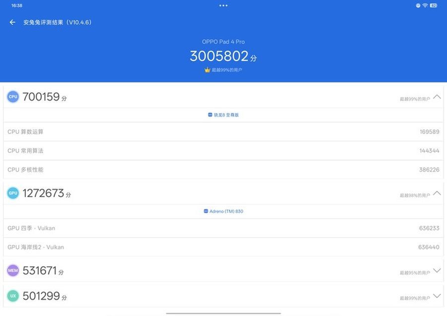 OPPO Pad 4 Pro是首款搭载骁龙8至尊版的安卓平板电脑,这颗芯片的参数这里就不赘述了,不少网友此前怀疑这款平板搭载了所谓“残血”版芯片,但不论是300W的安兔兔跑分,还是硬件检测信息来看来看,OPPO Pad 4 Pro搭载的就是满血版骁龙8至尊版,这下可以打消大家的顾虑了。此外,它还搭载了潮汐引擎3.0与34857mm²天工散热架构MAX,性能表现非常稳。