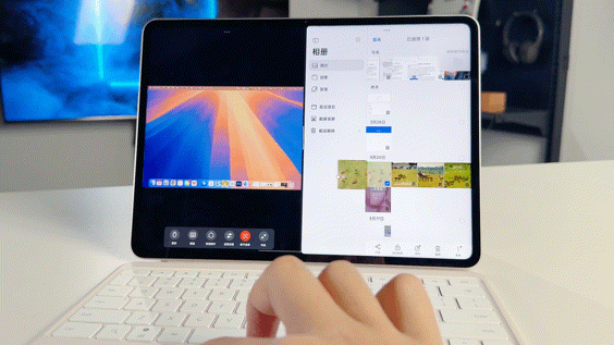 在远程控制的同时,系统还能开启分屏模式,左侧是Mac的桌面,右侧是平板的系统界面,照片、文件等都可以相互拖拽传输,工作效率大大提升。