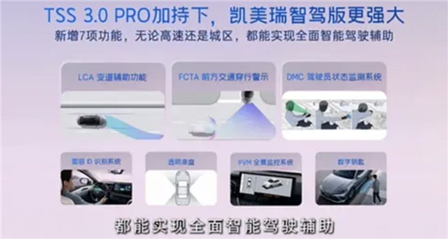 与现有车型相比,凯美瑞智驾版在智能驾驶辅助技术方面进行了显著升级,标配了TSS 3.0 PRO智能驾驶辅助系统,新增了LCA变道辅助、FCTA前方交通穿行警示、DMC驾驶员状态监测等功能。这些增强的智能技术大大提升了驾驶安全性和便利性,符合现代消费者对智能化配置的高需求。