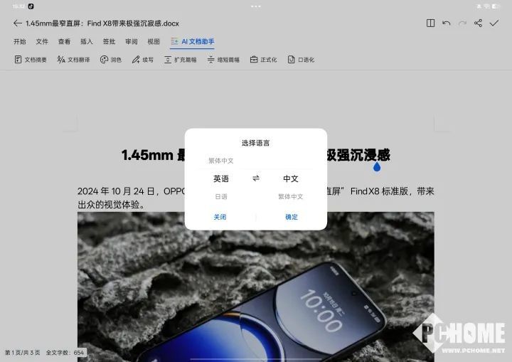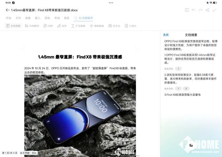 ColorOS 15在办公场景方面也能极大提供工作党的效率,AI文档助手三个功能将我们高频使用的文档应用变得更加智能。支持全局搜索各个App的文档,OPPO文档还能打开各个格式的文档。还支持文档翻译,原文和翻译内容能对照浏览。对文档进行润色、续写等等操作也是不在话下。