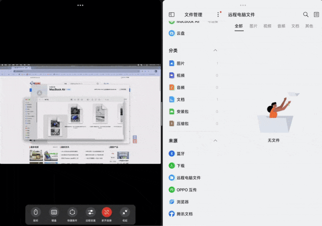 非常利于打工人的一个功能是OPPO Pad 4 Pro支持远程控制Mac,除了能浏览Mac的文件、视频、修改文件之外,还能实现在公司也能操控家里的电脑传输文件,开会时要用的PPT忘在家中的电脑里也不用担心。