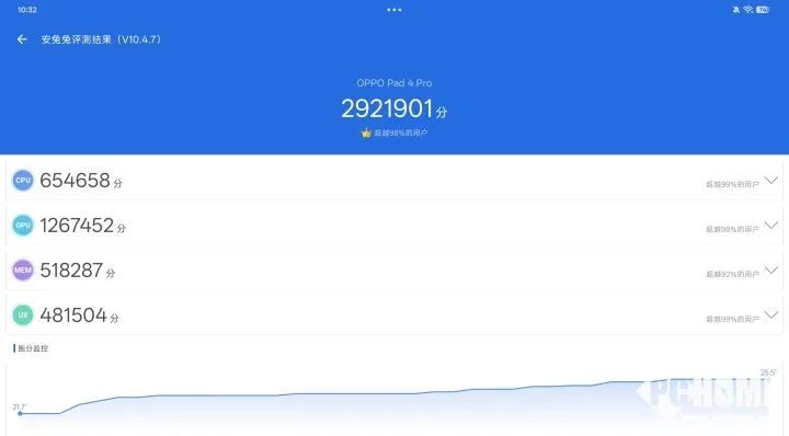 来看看搭载骁龙8至尊版的OPPO Pad 4 Pro的跑分,在常温测试场景下,使用安兔兔V10版本,测试的是OPPO Pad 4 Pro的16GB+512GB版本,分数为2921901分。