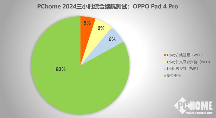 在续航表现方面,OPPO Pad 4 Pro搭载了12140mAh容量电池,实测3小时综合耗电,环境温度23℃左右,屏幕亮度为250nit,音量分贝为65db。连续在B站观看4K超清画质电影1小时+浏览社交平台1小时+刷短视频1小时后,耗费了17%的电量,OPPO Pad 4 Pro的续航还是非常令人满意的。