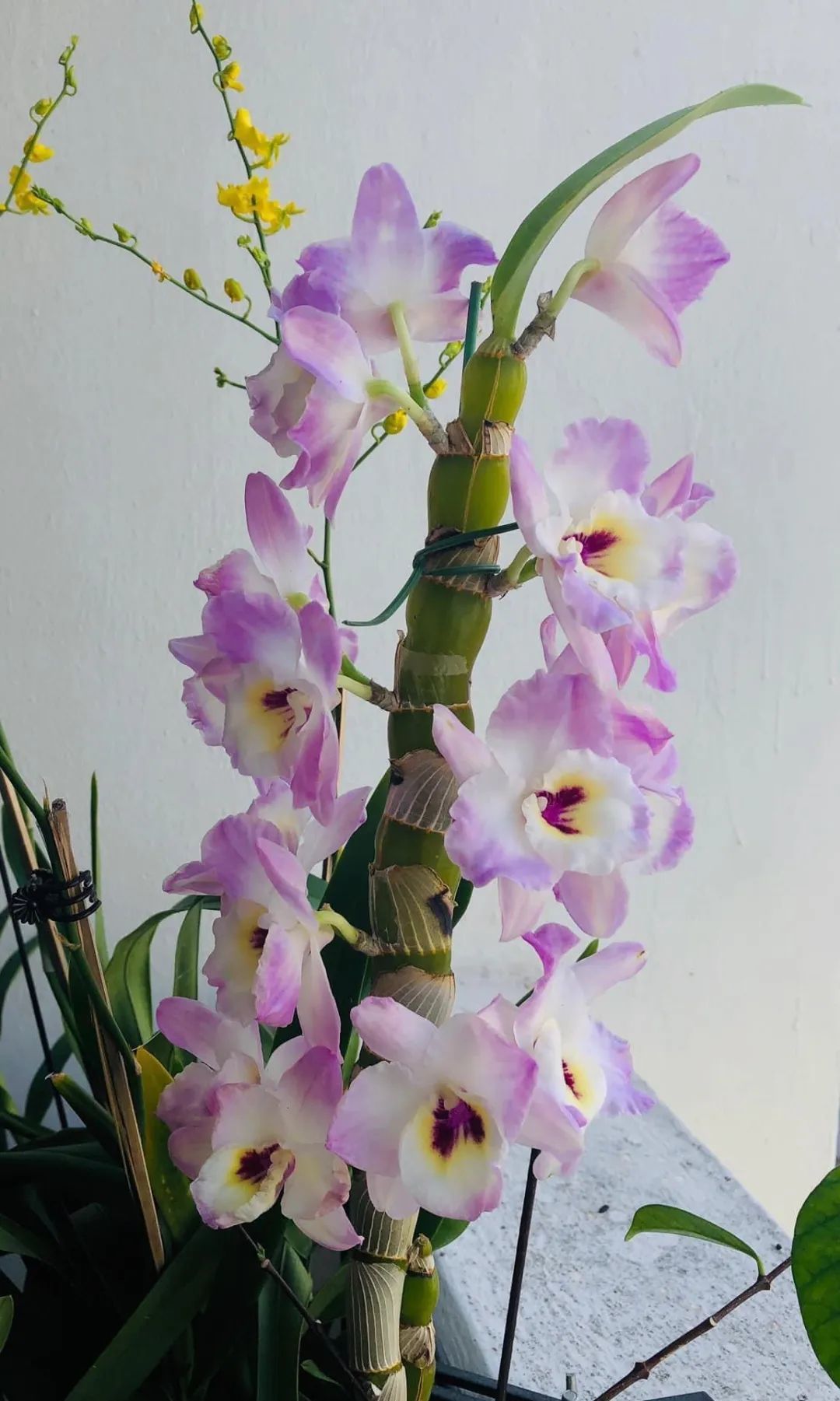 我们也可以直接把石斛兰固定在木板或树干上,但是要注意在根部适当包裹一些松鳞或水苔。平常养护的时候就注意定期浇水喷水,温度在18~25度,它的长势就会比较快一点。